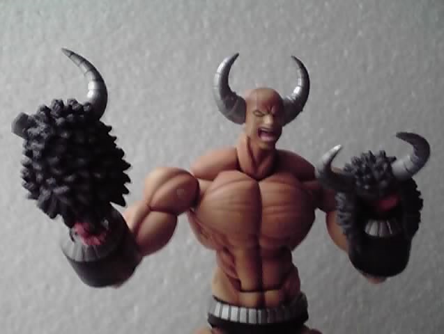 あと、「タッグ編」での右のツノが折れた状態とその後の長いツノを付けた状態(ハリケーンヒート用)、「王位編」序盤での両方のツノが無いので包帯を巻いてる状態、「悪魔超人編」での額に傷が付いてたり右のツノが異様に伸びてたりしていた状態、これらには出来ません。というかバッファローマンの頭って、結構バリエーション豊富なのね(^3^;)