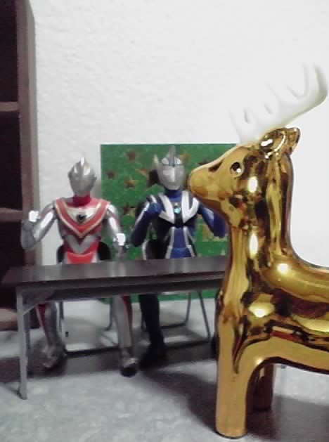 マイナスエネルギーを発しそうなくらい落ち込んでるアグルを見かねて、ガイアは残念会を提案するが、そんな2人の前に金色に輝くトナカイが!
