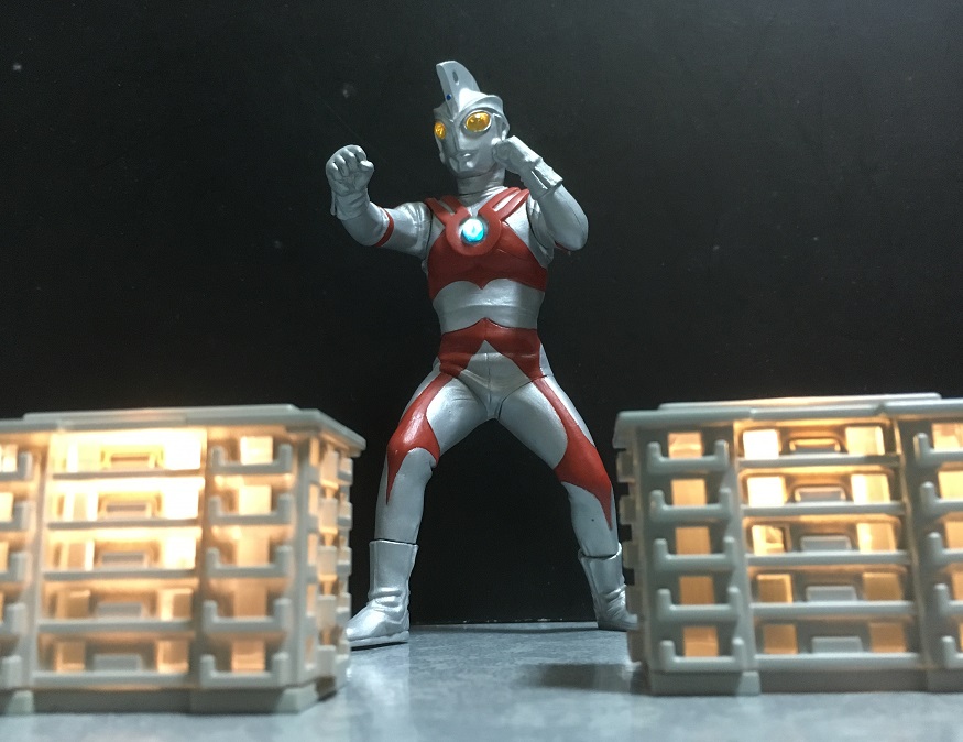 なお、メビウスが写り込んでいる画像を使っているが、これはエース単独の画像が全部、左脚の付け根がちゃんとハマってなかったからである。というか、この画像も右足首がキレイにハマってない…(-_-;)