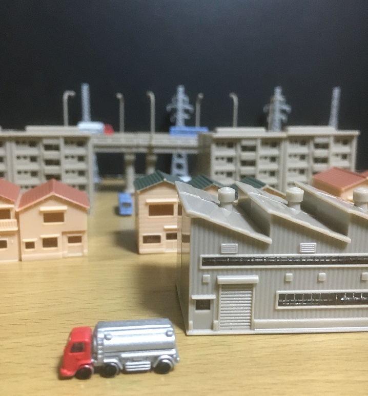 とゆー感じで、見えない所の省略加減が愛すべきマヌケさを湛えていますね、車の裏面なんか大胆過ぎて却ってカッコイイヨ!それを見る為に画像を拡大したら、壊れタワーもよく見えてしまうなんて!ダメージモデルと呼ぶことで折っちゃった皆なを救うヤサシサ。当たったアイテム全部使って写真撮るのが、何か子供の頃の遊び方っぽくてホクホク。高架道路の車達の然り気無さと、こっちに向かって来るバスの然り気無く成り切れて無さ!