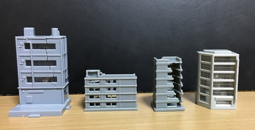 ←から、今回の「アルルミ ザク」のビル、「アルルミ ウルトラ11」等の解体中ビル2種、「アルルミ ウルトラ12」等の商業ビル。