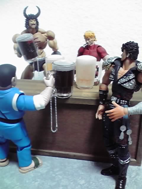 グラスが大きいっていうなら手や体がデカい人と並べればいいじゃない、って感じで屈強な男たちに集まってもらいました(・o・) 全員「少年ジャンプ」のキャラですが、フィギュアの発売元はバラバラです(^^;)(ちなみに両さんがS.H.Figuarts.、ケンシロウがリボルテック、バッファローマンが超像可動、コブジョー・ギリアンがfigma)