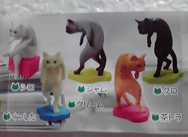 全6種となってますが、例によって色替えで種類を増やしています。とはいえ猫の種類が違うので、ポーズが同じでも頭の形が違う物もあり、4つの造形(内2つずつが頭部以外が同じ)となっているようです。