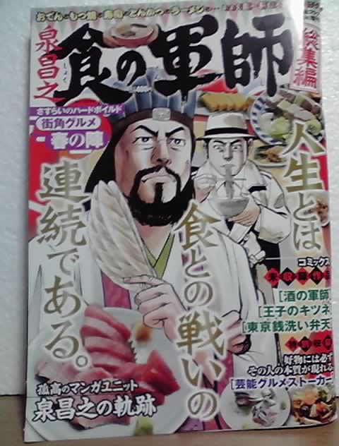さて『孤独のグルメ』の原作者の久住昌之氏は、泉晴紀氏と組んで泉昌之というペンネームでデビューしました。泉昌之先生のマンガというと数多くあるのですが、私的には現在「週刊ゴラク」で月イチ連載されている『食の軍師』ですね(^^)