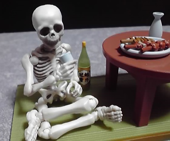 畳一畳に、ちゃぶ台、ヤキトリ3本とそれらを乗せる皿、日本酒の瓶に徳利とお猪口。