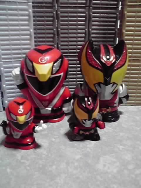 上の画像のデカいキバとゴーオンレッドは、キャラクター貯金箱の物です。