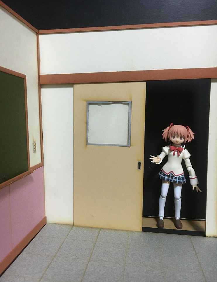 登場してもらったのは、久々に登場のfigma 鹿目まどか(制服ver.)です。新教室は公式で1/12スケールと明記されてますので、いい感じかと。