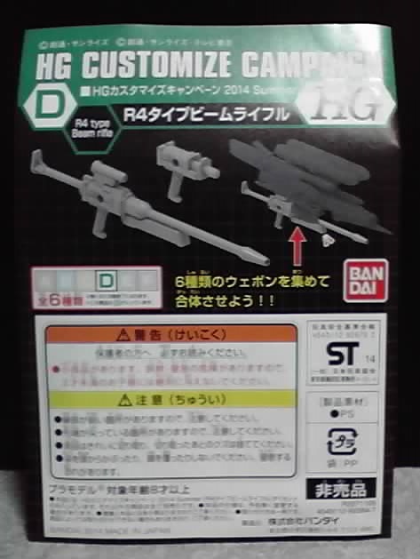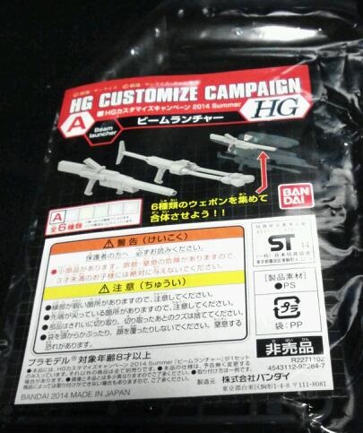 7・8月に「HGカスタマイズキャンペーン2015 Summer」というキャンペーンがありました。模型店などでガンプラの「HGシリーズ」のキットを買うと、この企画オリジナルのウェポンパーツが貰えるのです。