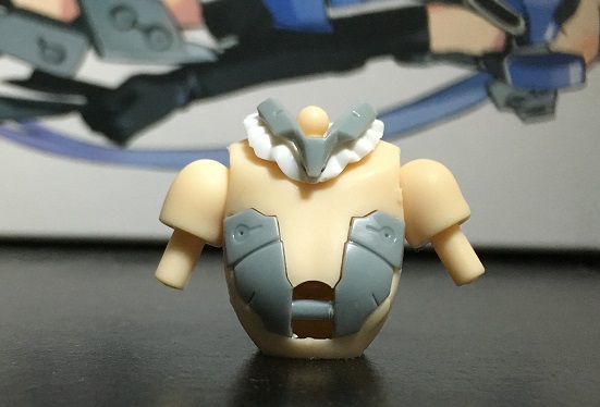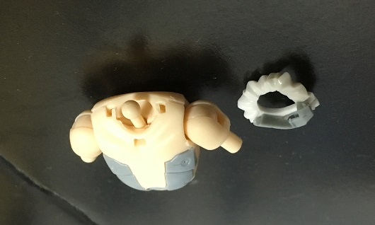 「これを首元に付けるんだけど、胴体の組み方が甘いのか、上手く固定できない。白いチョーカーを先に上から嵌めて、グレーのパーツを前から嵌めることで二重に固定するんだけど…」
