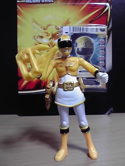 アメリカでは『戦隊シリーズ』の映像を一部差し替えて、『POWER RANGERS』として放送しています。『ゴセイジャー』の『パワレン』版である『POWER RANGERS MEGAFORCE』、今回お見せするはその『MEGAFORCE』の商品なのです。だからこのフィギュアはモネではなく、『MEGAFORCE』のイエローレンジャーということになります。
