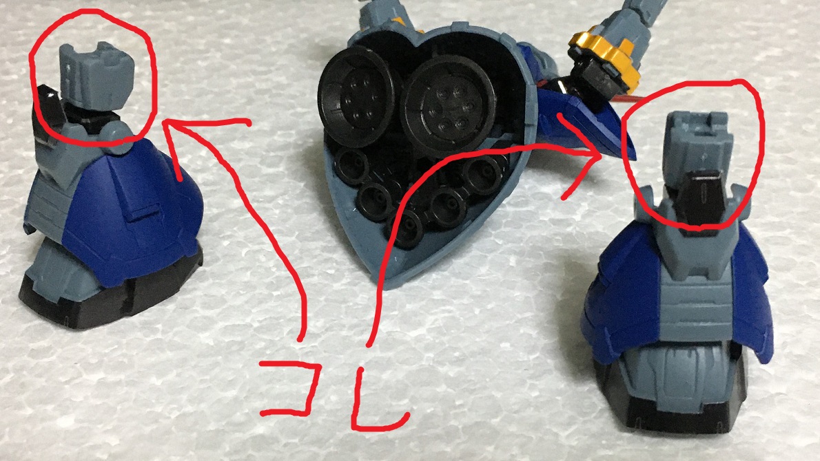 本体下部のデカいバーニア2つをはずし、代わりにそこに両脚を取り付けます。