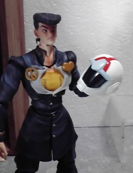 仗助の頭部をはずして、ヘルメットを置いてみました。メット内に詰め物なしなので、そのままだと首が埋まります。なので、少しのけ反らせています。