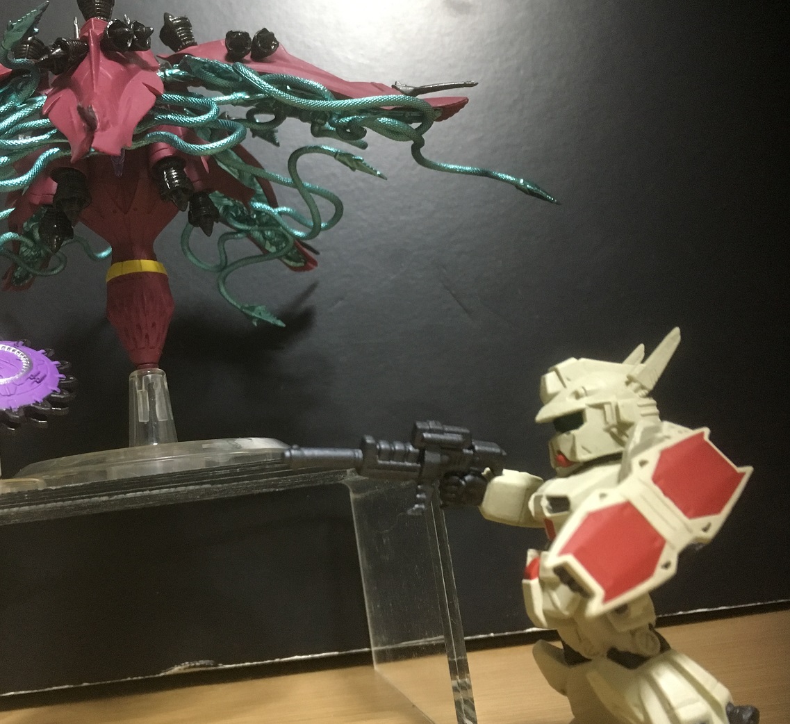 劇中ではビルギットの24番機はバグ戦で撃破されたので、ラフレシア戦には参戦できませんでした。しかしこの商品は「ヘビーガン&ラフレシアオプションパーツセット」。if対決を楽しむぜ~~~