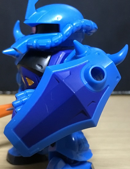 口にあたる排気口およびそれに繋がる動力パイプもザクⅡの物より大きく、両肩のアーマーに付いたスパイクも長い物になっています。
