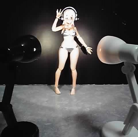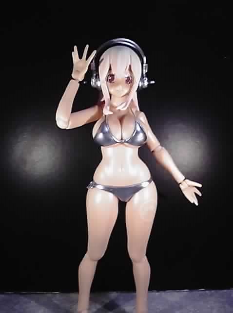 写っている人は、おなじみfigma すーぱーそに子(日焼けver.)。左右からの照明により、褐色の肌と銀色のビキニも光に映えますが、何よりの恩恵は胸の谷間がクッキリしていることでしょう(^3^)/