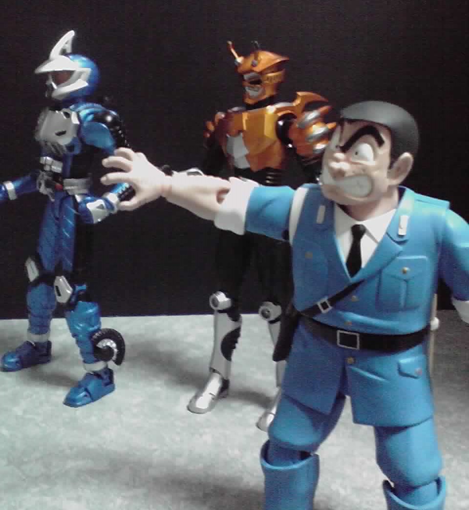 はい。両さんの紹介も今回で最後っていうことで、今回は豪華に『仮面ライダー』シリーズの警官2人に登場してもらいました。仮面ライダーシザース(須藤雅史)と仮面ライダーアクセルトライアル(照井 竜)です。2人とも両さんと同じS.H.Figuartsです。