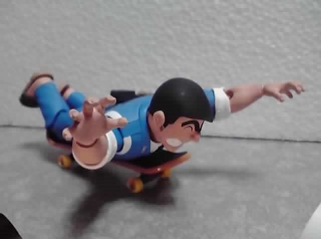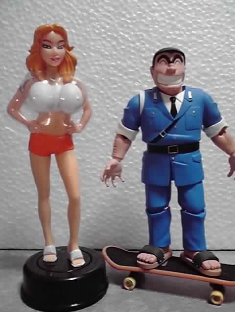 怪しい人形は台座に固定されているので、両さんの方もスケボーに乗せてみた。