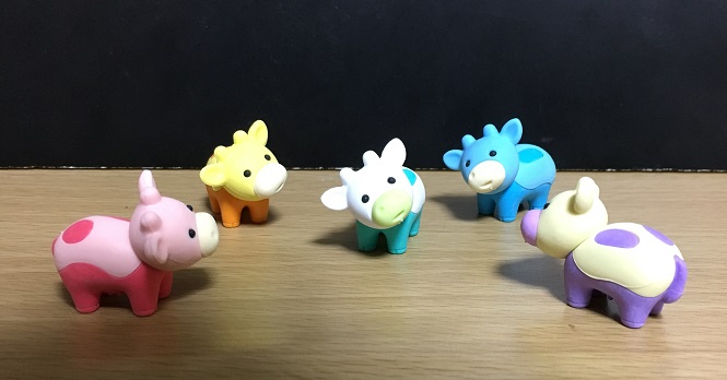 ↑の画像の通り、同型色違いの牛型の消しゴム5種類が専用の箱に入っている商品です。