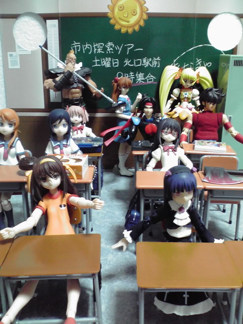ロッカーや、後ろの黒板の絵が描かれたイラストは、プライズ景品の物。