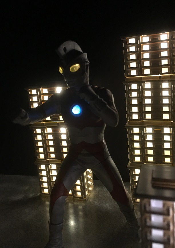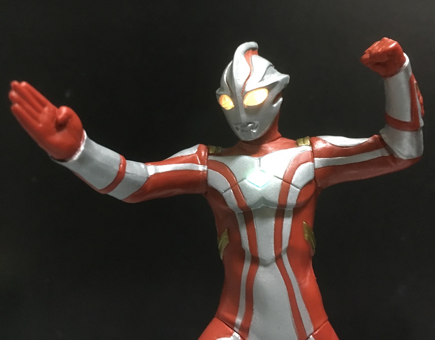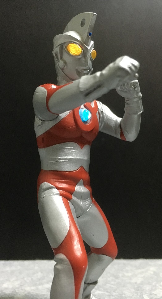 なお、エースは額にもウルトラスターと呼ばれるランプがあるのですが、残念ながらこちらは塗装で再現されているので光りません。セブンのは光ったのですが、セブン兄さんはカラータイマーの方が無いからなぁ(^u^;)