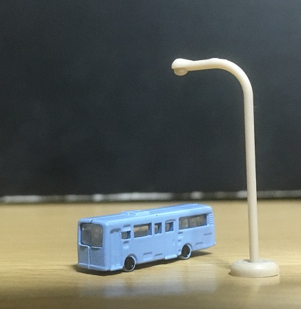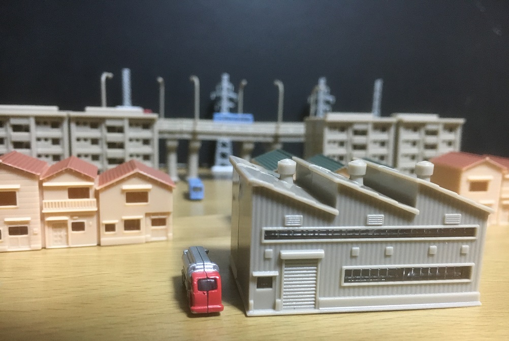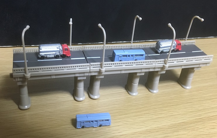 とゆー感じで、見えない所の省略加減が愛すべきマヌケさを湛えていますね、車の裏面なんか大胆過ぎて却ってカッコイイヨ!それを見る為に画像を拡大したら、壊れタワーもよく見えてしまうなんて!ダメージモデルと呼ぶことで折っちゃった皆なを救うヤサシサ。当たったアイテム全部使って写真撮るのが、何か子供の頃の遊び方っぽくてホクホク。高架道路の車達の然り気無さと、こっちに向かって来るバスの然り気無く成り切れて無さ!