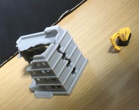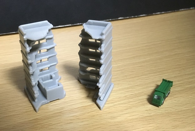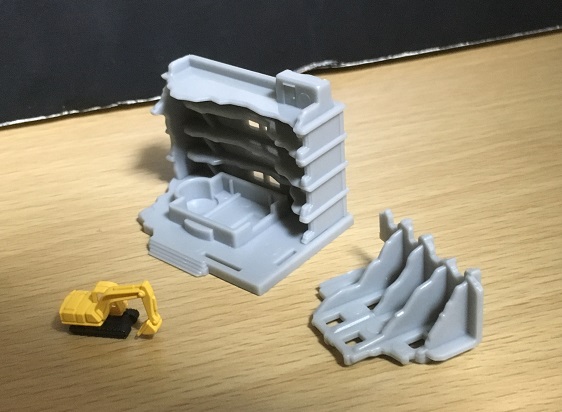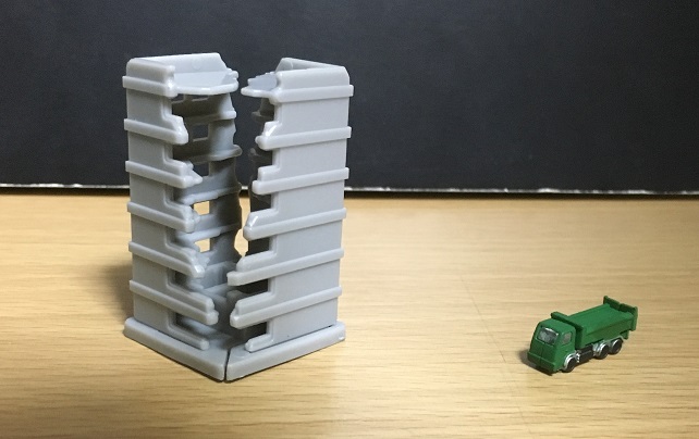 これらのビルですが、そのまま解体工事中として使うだけでなく、攻撃を受けて壊れたビルとして使うこともできます。パーツをバラしたり横にすることで、攻撃されて崩れた建築物のガレキとして使っても面白そう。