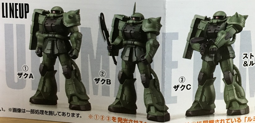 ストラクチャーAとBを紹介しましたが、この他「アルティメットルミナス ザク」には、ザクが3種類あります。が、私は持っていません。