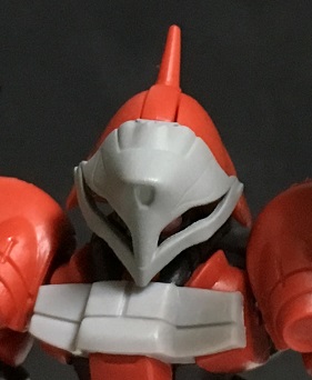 モノアイのスリットの上に鋭い目の意匠のマーキングが施され、頭部の形状とも相まって、どこか猛禽類的な雰囲気。