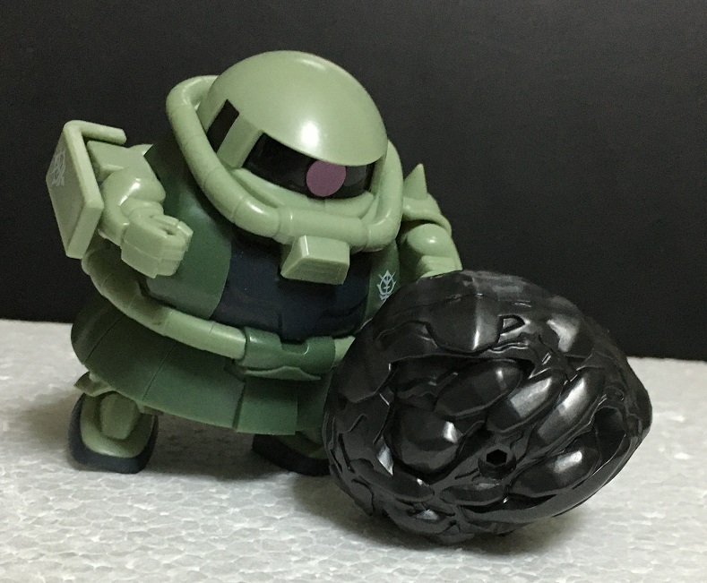 手近にあった岩を持たせたら、君たちが好きなククルス・ドアンのザクの完成だ!