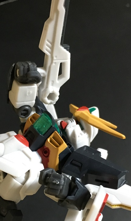 あと、頭部のヘッドバルカン、胸部のブレストランチャーの内蔵機関砲2種類。ちなみに設定の武器一覧には載っていないことが多いのですが、胸の黄色いダクトのちょっと上にある丸い砲門はマシンキャノンで、これまた機関砲です。