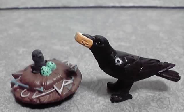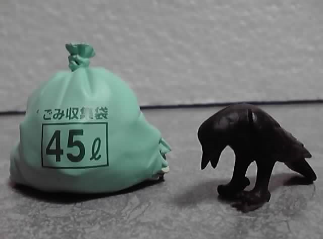 前弾のゴミ箱(グリーン)に付属した、口にパンの切れ端を咥えているカラスが付属しますが、前作は食べ物を見つけた、今回は雛にエサをあげようとしているという、造形は同じでも違ったシチュエーションになっています。