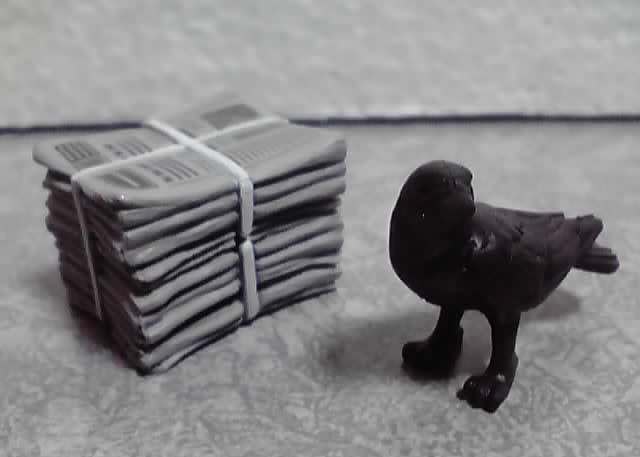 前弾のゴミ箱(グレー)に付属の横向いてるカラスと、新作の新聞の束のセットです。