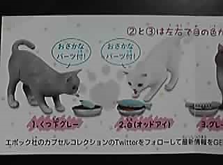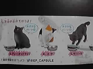 前弾は3つの造形を2通りずつの色分けにすることで全6種類にしてましたが、この「おかわり!」でも猫の造形自体は同じ物を使っています。