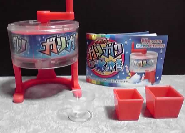 手前の四角いの2つは製氷器で、これに水を入れて実際に氷を作れば、氷かき器でかき氷が作れます。その際は、画像て前のグラスに入れましょう。