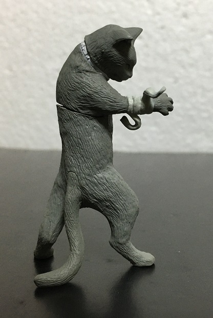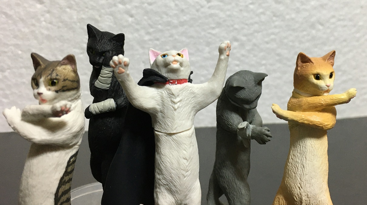 まあそれよりも、猫の尻尾が地面に着いてる方に注目してほしい。この商品のネコ達は皆、二足歩行状態になっていますが、尻尾を第三の足にすることで三点直立しているんだ。