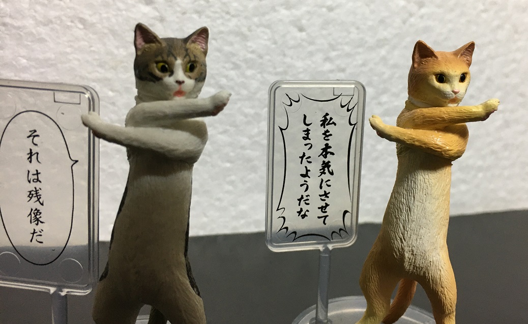 猫達が〝それ〟っぽい顔とポーズをして〝それ〟っぽいアイテムを身に着け、さらには〝それ〟っぽいセリフが描かれたプレートが横にあったりします。