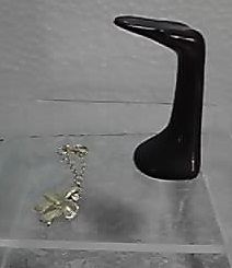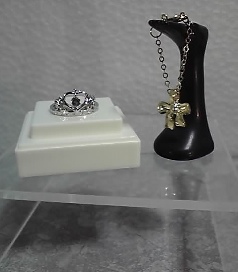 ←がゴールドリボンネックレス(ブラックハンドトルソー付き)、→がシルバーティアラ(ホワイトティアラスタンド付き)です。
