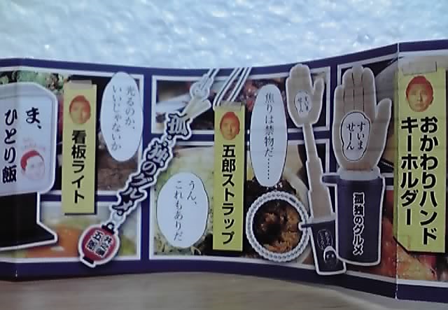 「看板ライト」「五郎ストラップ」「おかわりハンドキーホルダー」「今、何腹だ?箸立ておみくじ」「つぶやきネックストラップ」の全5品+シークレット1品。
