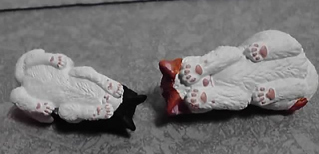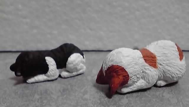 全12種となっていますが、猫背で立ってる猫、猫背で座ってる猫、猫背で立ってる子猫の3つの素体をそれぞれ4通りの塗り方をすることでラインナップを増やしています(^3^;)