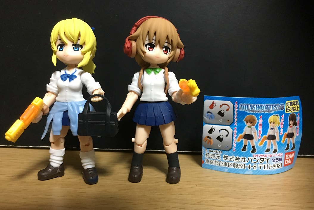 補足しておくと、今回紹介したのは第3弾の「AQUA SHOOTERS! 03」。全5種類で、お見せした3つのアイテムの他にキャラがもう1人と色違いのオプションセットがあります。