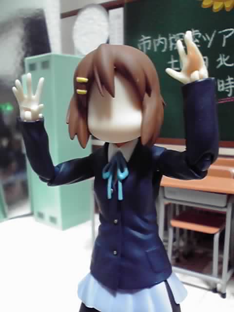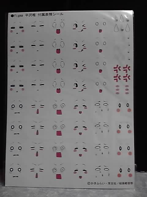 以前(2010年11月10日の記事参照)も紹介しましたが、figma 唯に付属の顔パーツは3種類で、通常の笑顔とキリッとした顔、そして左の画像ののっぺら顔が入っています。そののっぺら顔に付属のデカールを貼って、本編で見せる様々なギャグ顔に出来ます。