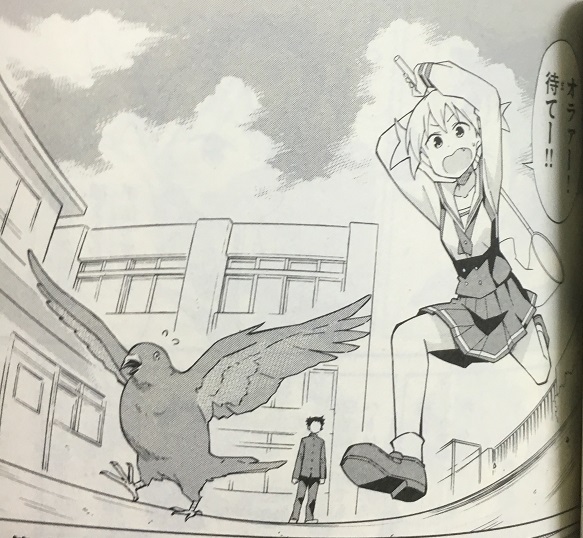 マジックに使うハトにしようと、千晶がハトを捕まえようとしている場面です。
