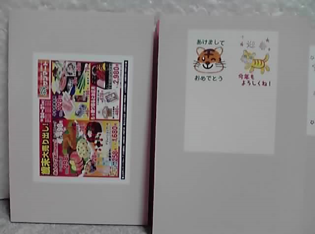 チラシ、年賀状、カードゲーム用のカード、塗り絵です。表彰状や三角ペナントと違い、どれも裏表にキッチリ印刷されている方が嬉しい物ばかり。まあ塗り絵は、この見開きの裏面が表紙というトンデモナイ代物になってますが(--;)