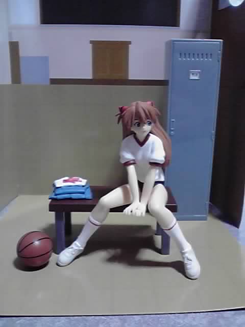 アスカのフィギュアとロッカー、制服、ベンチ、バスケットボール、そして背景になる台紙です。