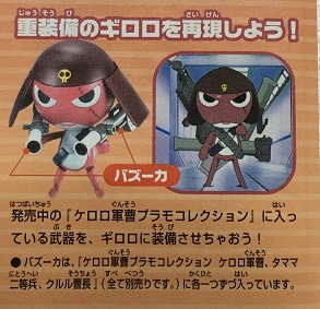 「No.1 ケロロ軍曹」等に付属するバズーカを装備させれば、重装備の「ギロロ伍長」を再現する事もできます。このバズは穴が空いてるので、先述の通り背中に装備する事もできるようです。