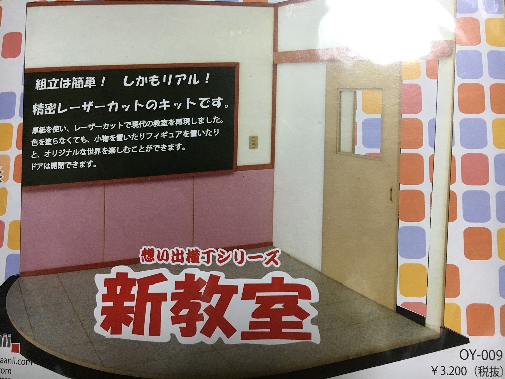 「想い出横町シリーズ」は、昭和初期~中期辺りの生活用品や部屋を再現した紙製や木製の模型で、特に学校関係のアイテムが充実。その中に「昭和の教室」という物があるのですが、その「昭和の教室」の部品を一部変更して現代風の教室にした物が今回の「新教室」です。なので「想い出横町シリーズ」に属しながら、あまりレトロな感じがしないアイテムです。