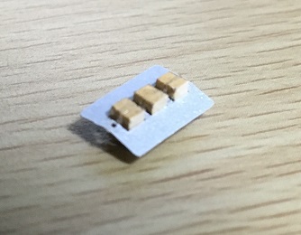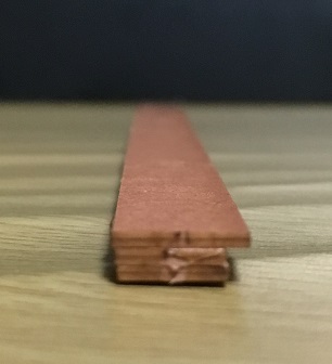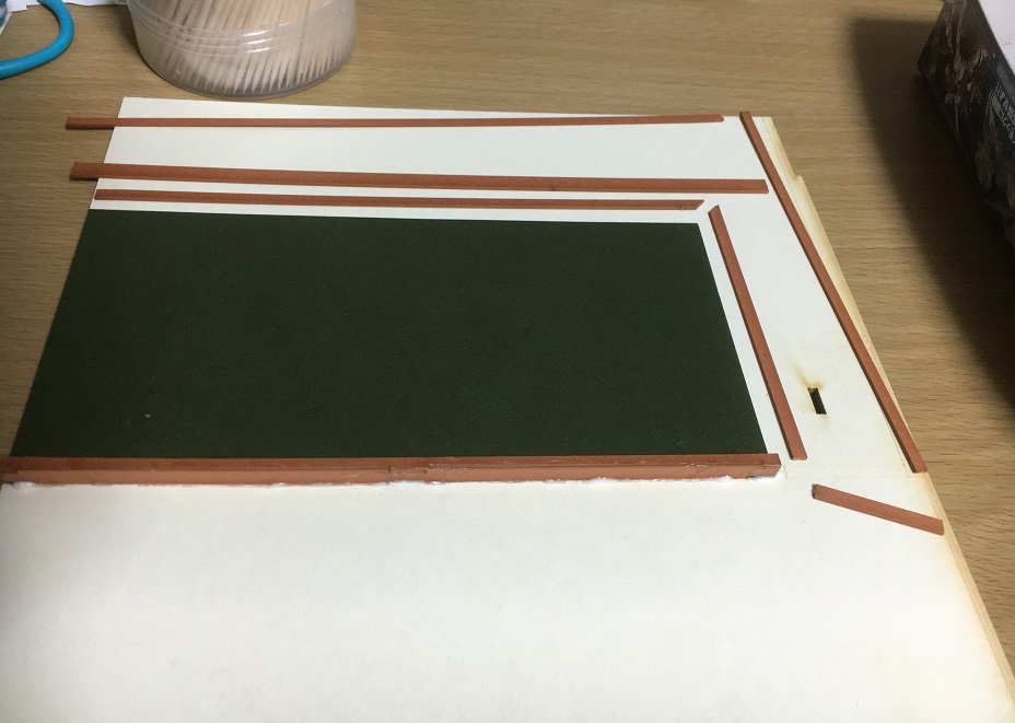 1つだけ小さい方を壁に向けて接着し、その下を戸が通るようにします。手前2枚は戸が前に倒れないようにするストッパーとなります。3枚をズレなく重ねるのも大変ですが、貼り付けで塗ったボンドの分だけ厚みが増したり、はみ出たボンドがレールとなる部分に出てきたりで、後で修正するのも大変でした。