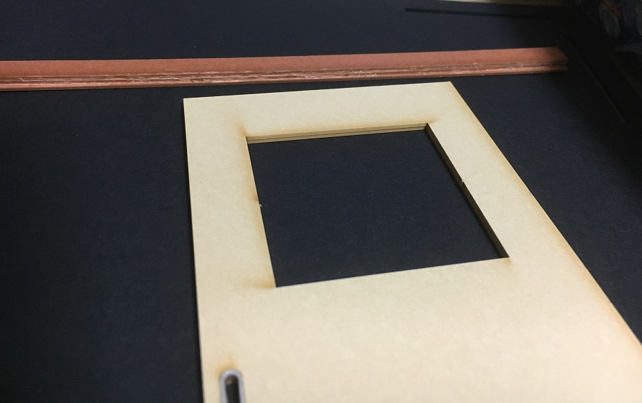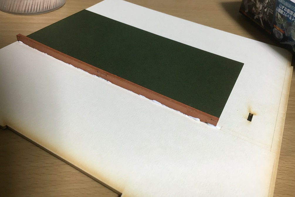 厚さを出す為、同じ物を2枚貼りつけるのですが、やはりズレないようにするのが大変。更に、それに少し小さい板を貼り付けます。