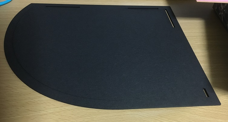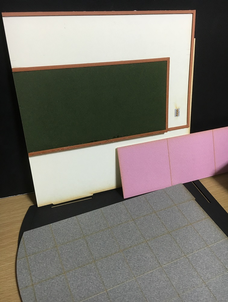 形は四角ではなく、角の1つが曲線状になっています。教室の右前方の風景を切り抜いた模型なので、単品の商品としてはこれで正解ですが、拡張性は一切考えられてないことも分かり、ちょっとションボリ。複数集めて組み合わせたら教室全体が完成する、みたいなのがよかったなぁ…