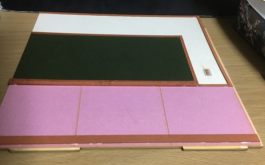壁自体も厚さを増す為に、裏に黒色の厚紙を重ね貼りしてます。やたらデカいから、塗布面が広過ぎです。